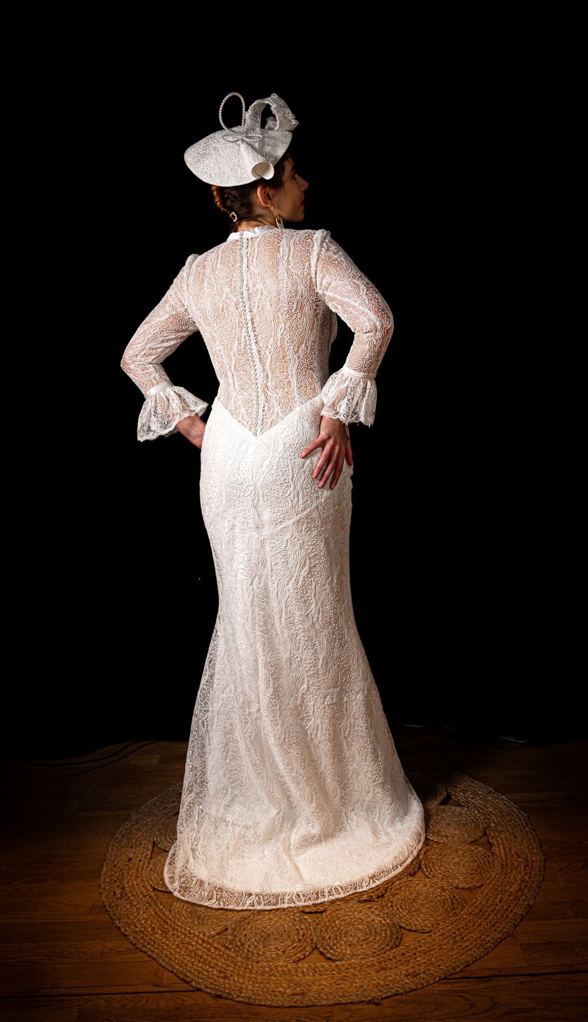 Robe de mariée SANZA : une création d'exception en dentelle délicate ornée de perles. Sa coupe sirène épouse les courbes avec élégance, la transparence du dos révèle une sensualité subtile raffinée. Complétée d'un chapeau personnalisé assorti, cette robe incarne le luxe et l'originalité pour une mariée UNIQUE.